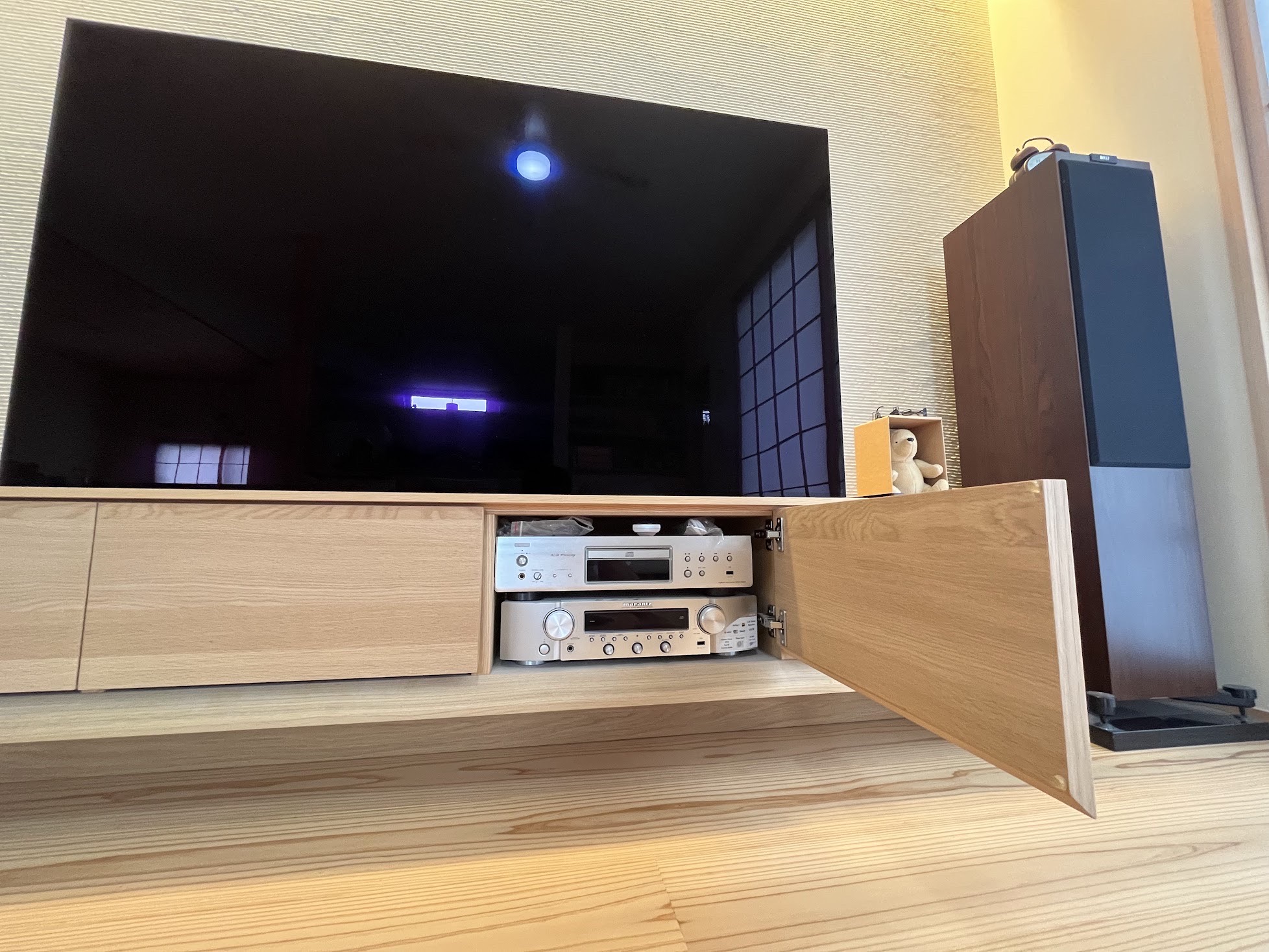 外観はスリムで控えめ。奥行きが短く、リビングのAVボードにもすっきり収まる。実際上位のModel 40Nは奥行きサイズがテレビ台に収まりきらず断念することになった。