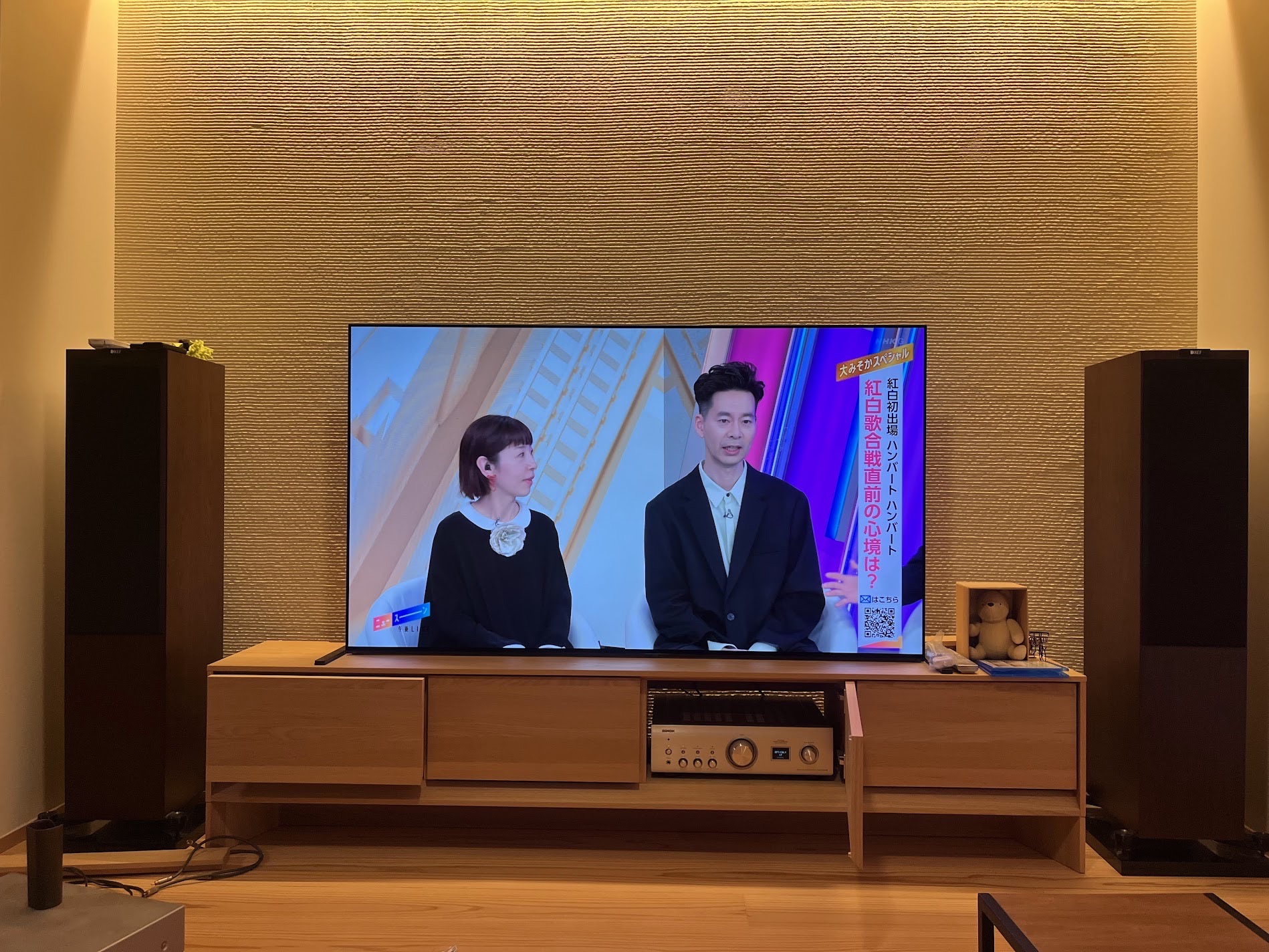 低音の制動が難しくて正直ブックシェルフ型でも良かった気はするけど、65インチテレビの両サイドにでっかく構えてバランスは取れている。