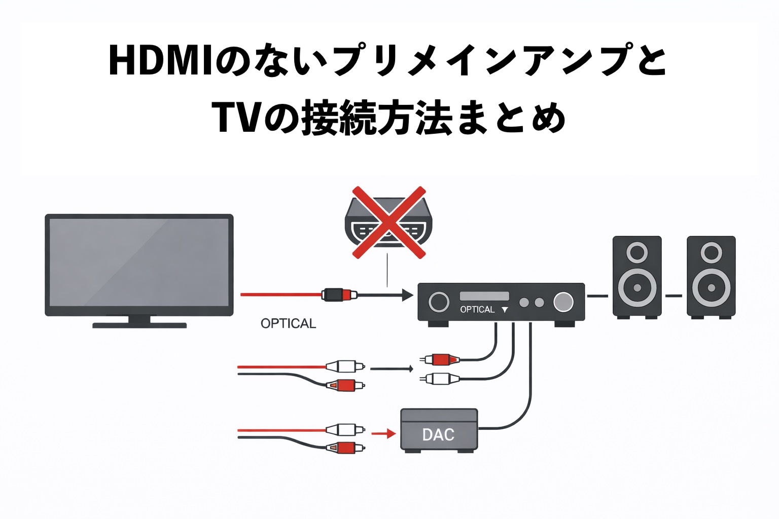 HDMI入力のないプリメインアンプでも、テレビ音声の接続は光デジタル、アナログ、外部DACのいずれかで成立する。HDMI ARCやeARCがなくても、音声だけを取り出してアンプへ送る構成を選べば、テレビ視聴時にスピーカー再生は可能になる。